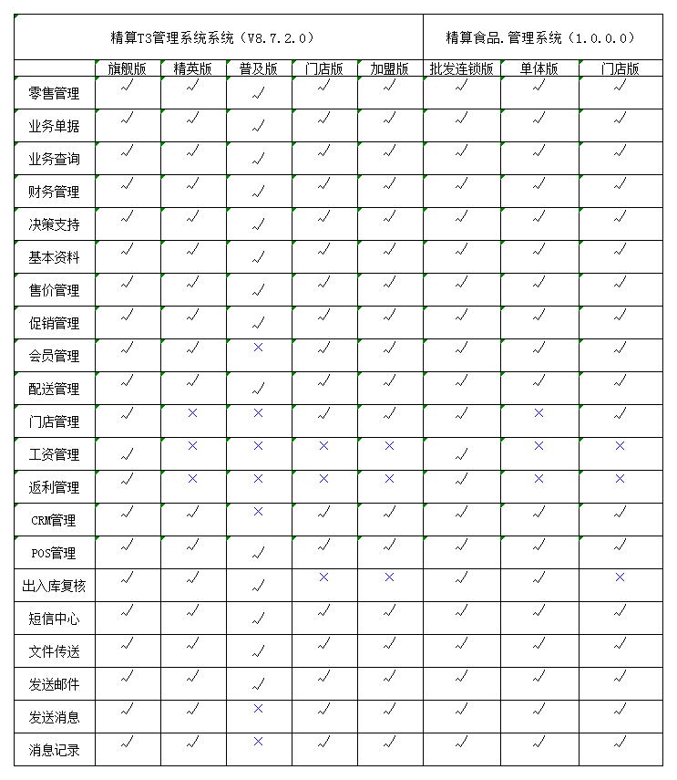 | 产品特点    采购管理 销售管理 存货管理 账务管理 委托业务管理 会员管理 积分管理 数据中心分析 加盟店管理 自营店管理 商品多编码管理 辅助业务管理      卓越精算T3不管在软件安装,日常业务操作,还是数据安全保护方面,都做出了重大的易用性的设计和突破。 软件支持全英文键盘操作,系统中常用功能都设计了快捷键调用,极大地方便了操作人员使用。系统各模块间基本操作方法保持高度一致性,方便用户在短时间内掌握整个系统模块操作方式。  轻松掌握企业核心财务数据   企业老板实时了解公司发生的各种业务情况、资金运转情况和获利能力,包括销售情况、采购情况、库存情况、资金变化、往来账款等信息,从而快速做出决策,业务开展更加高效。 版本划分 旗舰版 精英版 普及版 门店版    适用于批发企业 专卖店、零售企业 适用于连锁经营企业 适用于其他有进销存管理 与财务需求的企业 关于卓越精算T3更多产品详情,咨询产品经理 028-66072626/66776666-8833 | 功能介绍 1、开单查询  前次开单查询:记录往来单位前50次的开单记录。 应用场景:如客户打电话或上门来拿货时,直接说,就要上次的那些商品,但是不记得名字时,就可以直接通过此功能快速开单,并且选择对应的商品。 2、适用天数  适用天数:从商品购买之日起核算,能使用多少天,当超过适用天数以后,可以针对会员进行短信通知。 操作方式:要对适用天数进行管理,首先在商品资料里要设置上商品的适合天数,并且在销售商品时必须是针对持会员卡消费的用户,这样才能有针对性的进行短信通知。 3、短信功能  自动发送短信功能:单据过账时可以直接发消息给往来单位或者会员,如会员在什么时候消费了多少,积分多少储值余额还有多少。 4、专款专用  专款专用:打的款只能针对指定的商品消费。 应用场景:针对化妆品或者母婴行业,其中一种品牌搞活动,预收多少钱就可以返多少钱的货,并且预收的这笔款只能用于提指定的商品。 5、储值卡结算  多张储值卡结算:在用储值卡进行结算时,如果A卡的上余额不足,可以用B卡进行结算,选择表体下方的储值结算,就可以用B卡结算,但积分积在A卡上。 6、POS收银  POS收银:将POS版本集成在综合版本里,直接在零售管理界面,就可打开POS收银界面,进行黑底白字的收银操作,店上可以只用电脑或者只用POS机,不用两种设备都购买。 7、单据上传  单据上传附件功能:可以单据上上传与图片、文档等与此张单据相关的信息。 8、单据多级审核  单据多级审核-----单据支持用户自定义审核级次,可平级审核也可逐级审核。 应用场景:公司管理较完善,每个步骤需要经人签字审核的流程。 9、促销  软件支持多种促销功能,可以针对不同的时间、不同的门店、不同的往来单位,进行不同的促销方式。如超量促销、限量促销、特价促销、买赠加价促销、捆绑促销等。 |